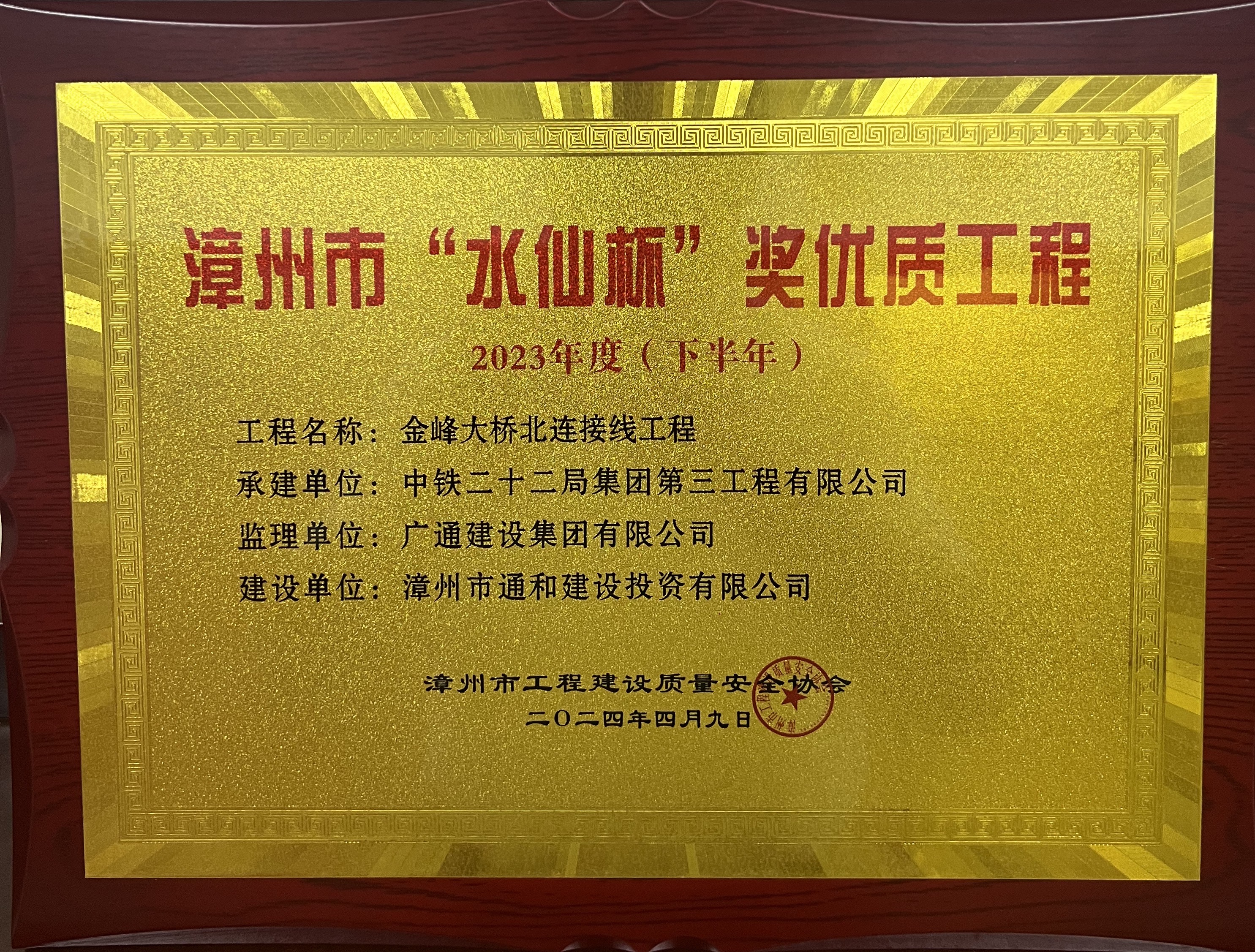 近日,漳州市工程建設質量安全協會公布2023年度(下半年)漳州市“水仙杯”獎優質工程獲獎名單。其中,漳州交通集團權屬交發建設集團金峰大橋北連接線工程及漳州市東環城路及其接線工程A1(A1-1、A1-2)合同段雙雙獲評漳州市“水仙杯”獎優質工程。