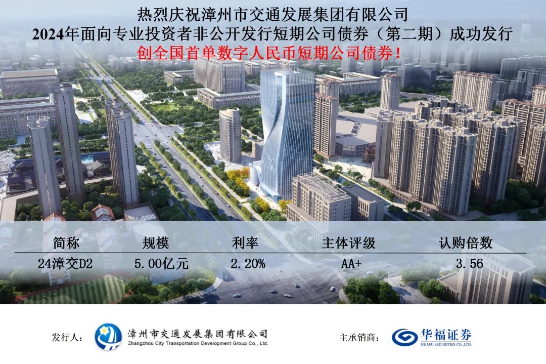 8月29日,漳州市交通發展集團有限公司成功發行漳州市交通發展集團有限公司2024年面向專業投資者非公開發行短期公司債券(第二期)。本期債券為全國首單數字人民幣短期公司債券,發行規模為5億元,債券期限為1年,主體評級為AA+,由華福證券擔任獨家主承銷商,發行利率為2.20%,全場認購倍數達3.56倍。