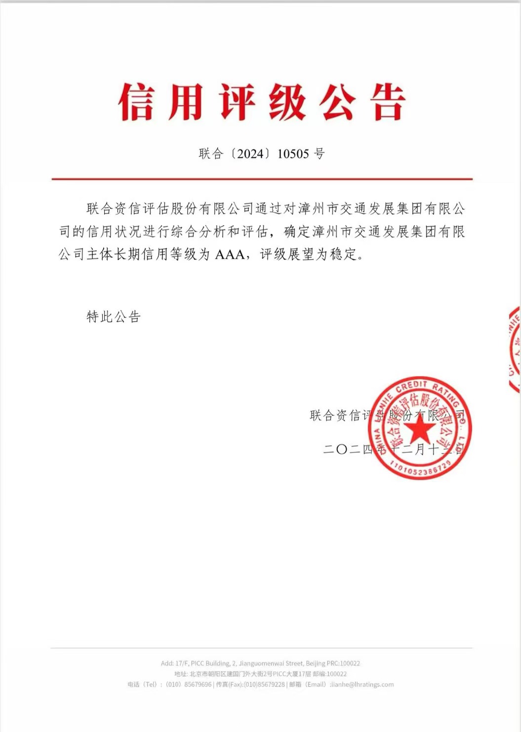 聯(lián)合資信是國內(nèi)最專業(yè)、最有影響力、最具權(quán)威的信用評級機(jī)構(gòu)之一。聯(lián)合資信授予漳州交通集團(tuán)AAA信用等級的認(rèn)證,充分體現(xiàn)了國內(nèi)信用領(lǐng)域?qū)φ闹菔薪煌òl(fā)展集團(tuán)有限公司綜合實力、信用水平、運(yùn)營能力、轉(zhuǎn)型升級和發(fā)展前景等方面的高度認(rèn)可。