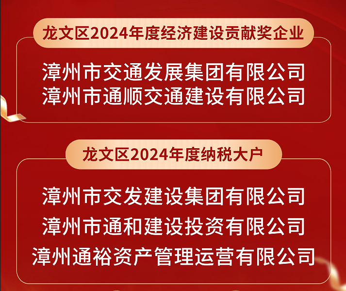 此外,漳州交通集團權屬漳州市通順交通建設有限公司亦獲得“龍文區(qū)2024年度經(jīng)濟建設貢獻獎”,漳州市交發(fā)建設集團有限公司、漳州市通和建設投資有限公司、漳州市通裕資產(chǎn)管理運營有限公司同時獲得“龍文區(qū)2024年度納稅大戶”表揚。